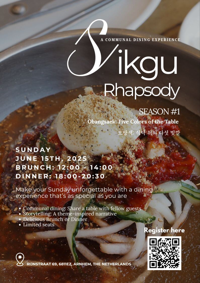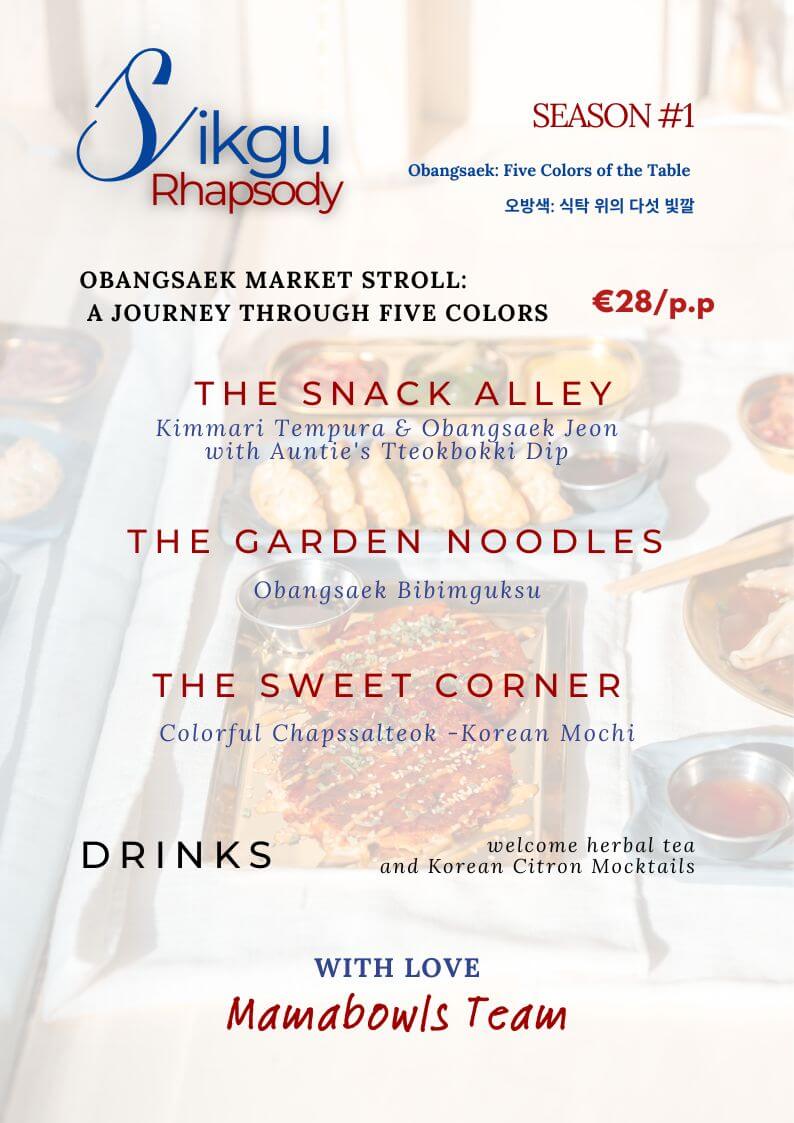 At Sikgu Rhapsody, we invite you to gather around one long table. To eat, yes—but more than that, to remember. To feel. To listen. This season, our journey begins with Obangsaek—the five colors that shape Korean life. Blue. Red. Yellow. White. Black. Each dish a color, each color a memory, each memory a story told by the chef who once watched her Korean aunties cook with quiet devotion and love. Come. Sit beside someone you do not yet know. Share the table. Share your heart. Leave as sikgu.